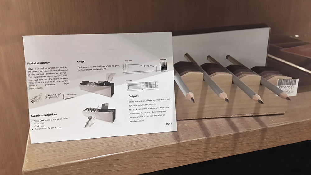 Row is the winning product of a competition organized by the National Museum of Beirut, currently selling in the museum’s boutique. Row is a desk organizer inspired by the pheonician boats artifacts formed with solid oak, brass rods and a cork base.