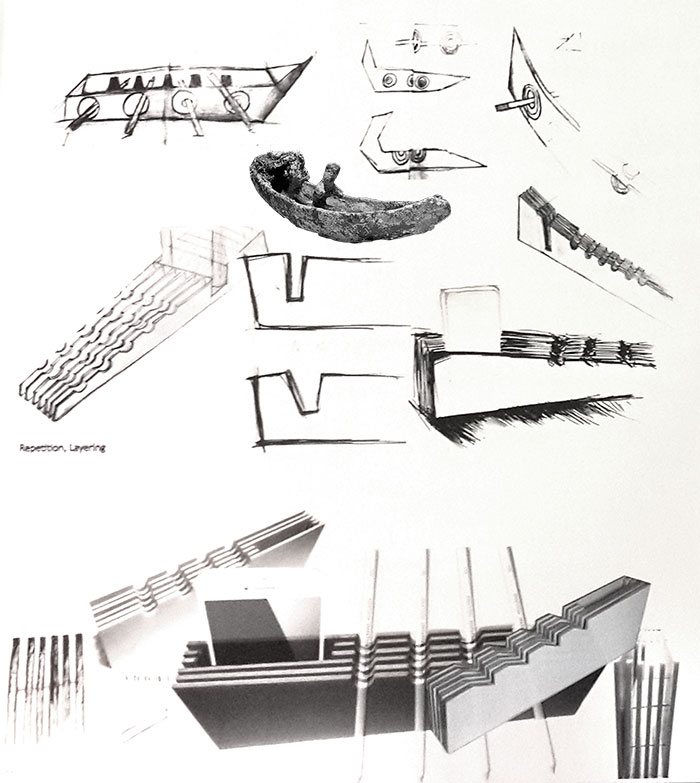 The longitudonal form, narrow back, extended front and sharp interruptions allow the user to experience the abstract pheonician boat interpretation.